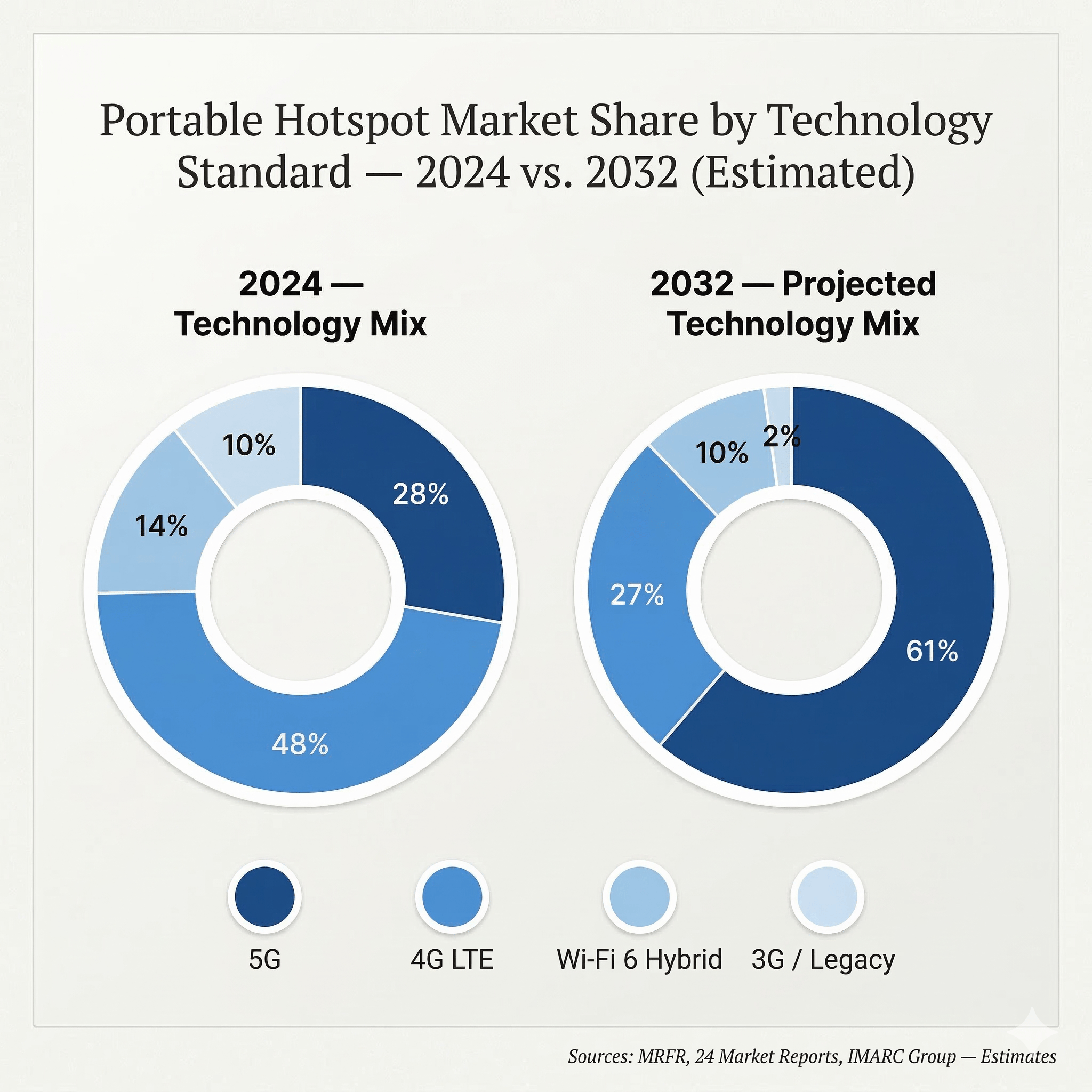 The shift above is not gradual — it's seismic. The 5G segment is projected to more than double its market share within this decade, while legacy 3G devices are rapidly being discontinued and 4G LTE, though still dominant today, will cede significant ground to its successor. Global 5G adoption is expanding rapidly, with subscriptions expected to approach 1.5 billion by 2025, increasing demand for advanced Wi-Fi hotspot devices.