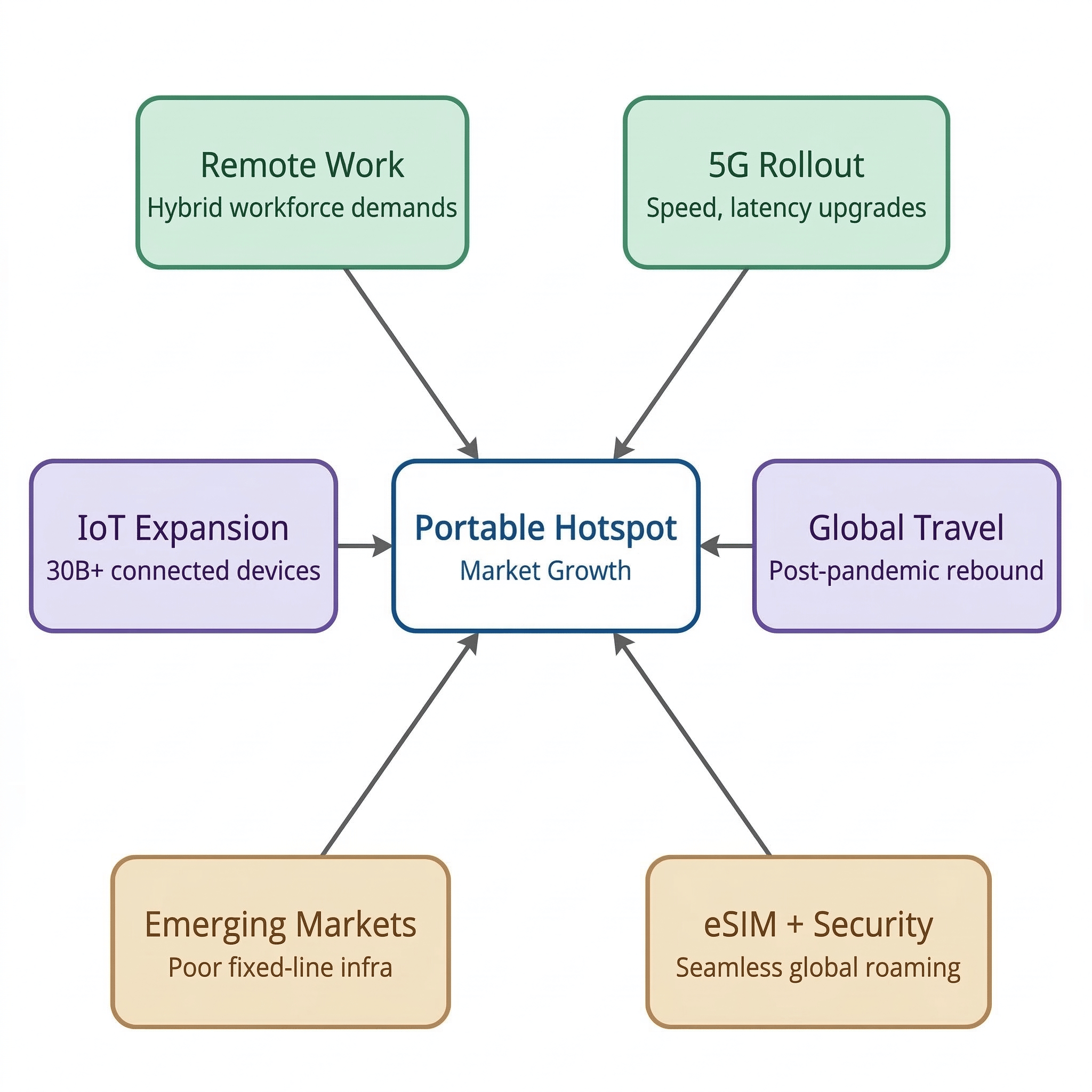 No market grows in a straight line for purely technical reasons. Behind every chart inflection point is a constellation of human behaviors, policy decisions, and technological leaps. In the portable hotspot market, four forces stand out with particular clarity.