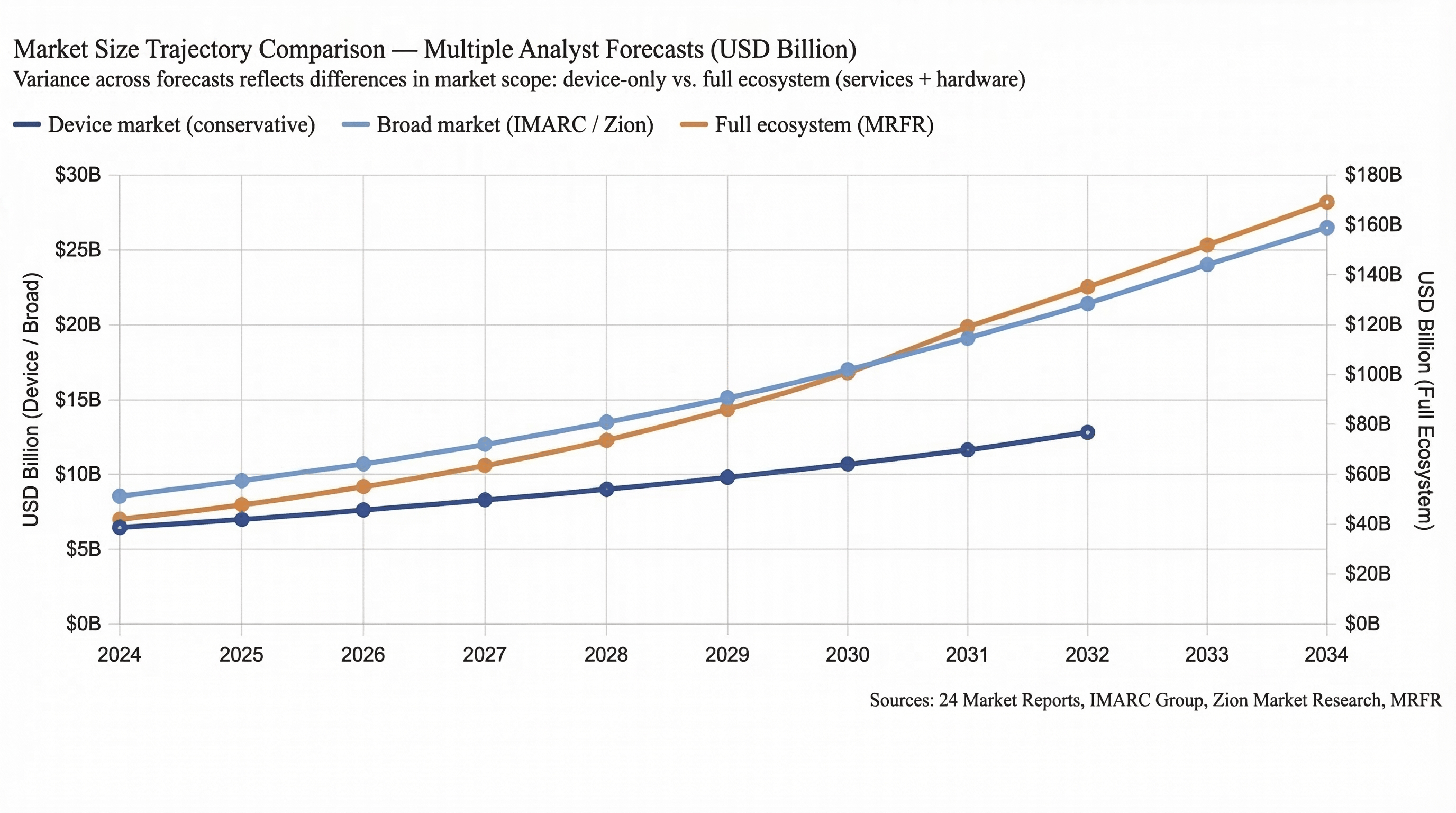 The wide variance between the conservative device-market forecast and the full-ecosystem estimate shown above warrants a brief methodological note. These figures are not contradictory — they measure different things. The narrow device-market estimate counts only hardware sales of dedicated portable hotspot units. The full-ecosystem estimate, produced by MRFR, encompasses the entire mobile hotspot value chain: hardware, carrier data plans, enterprise managed services, and cloud-based connectivity platforms. Both are internally consistent. The key takeaway is that regardless of which measure you use, the trajectory points unambiguously upward.