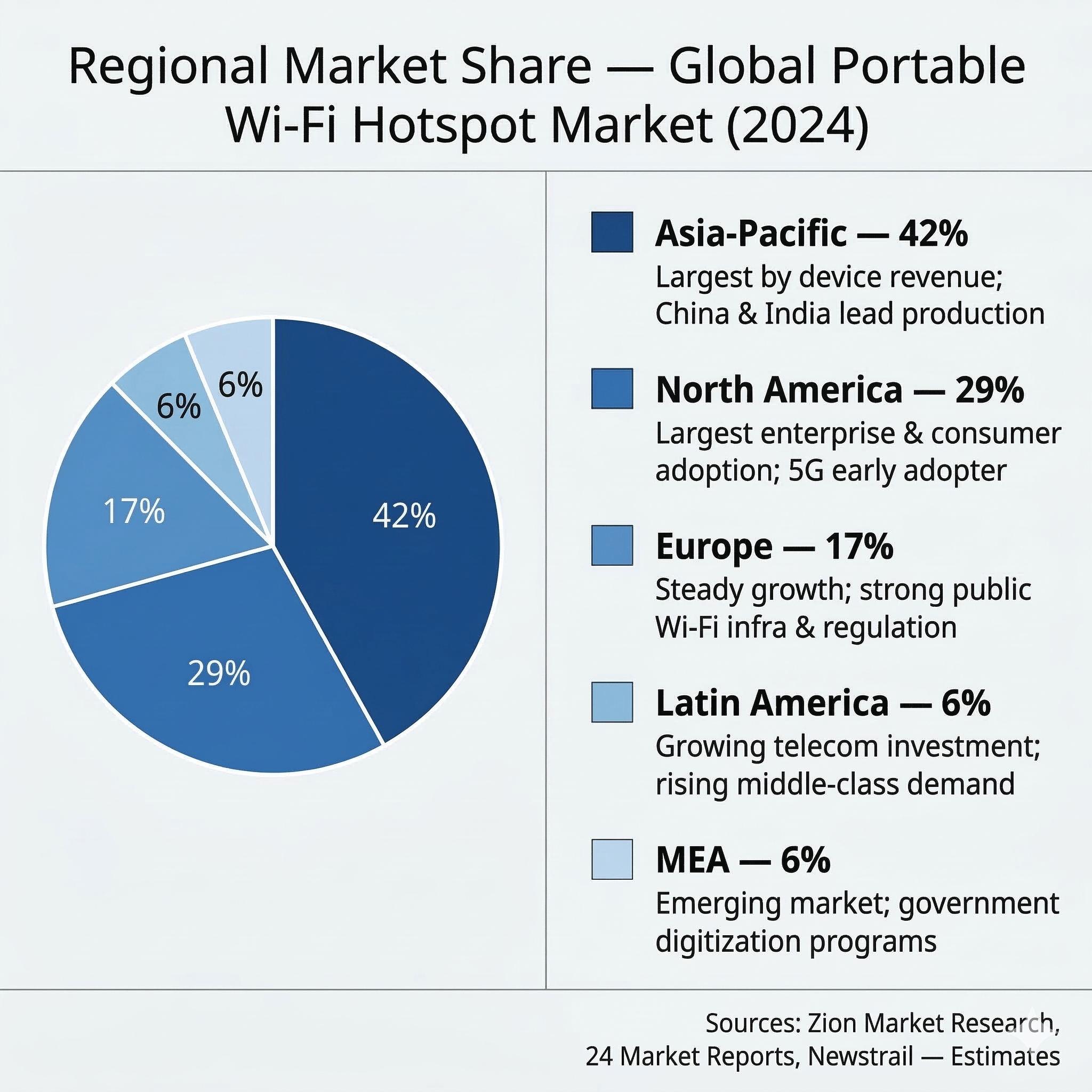 Asia-Pacific accounts for over 40% of global mobile Wi-Fi revenue, led by China, Japan, and South Korea, due to booming tourism and extensive 5G deployment. North America, meanwhile, holds the largest market share for mobile hotspots, approximately 45%, driven by high-speed internet demand, remote work trends, and 5G advancements. The discrepancy in those figures reflects different ways analysts segment the market — consumer hardware vs. full ecosystem revenue — but both signal the same competitive intensity across both regions.
